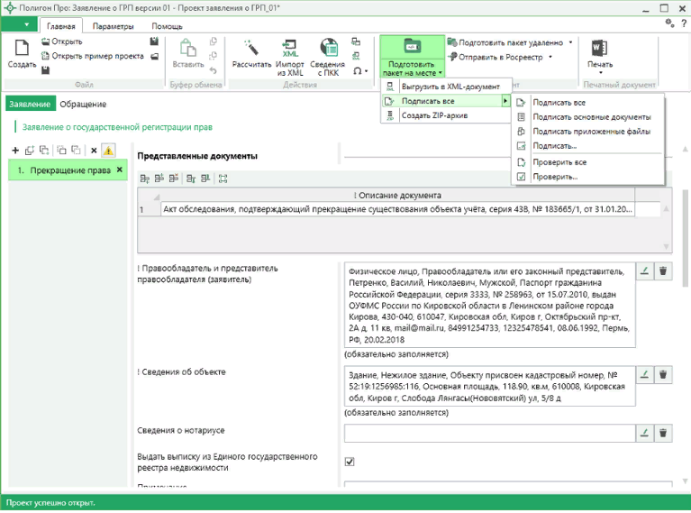 «Полигон Про: Росреестр» позволяет, не покидая рабочее место, получить государственные услуги по постановке объектов недвижимости на кадастровый учет, регистрации прав и обременений. Кроме того, в программе предусмотрена возможность взаимодействия с Удостоверяющим центром "Программный центр" для оформления электронных подписей.