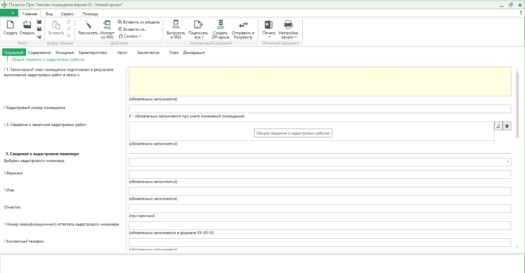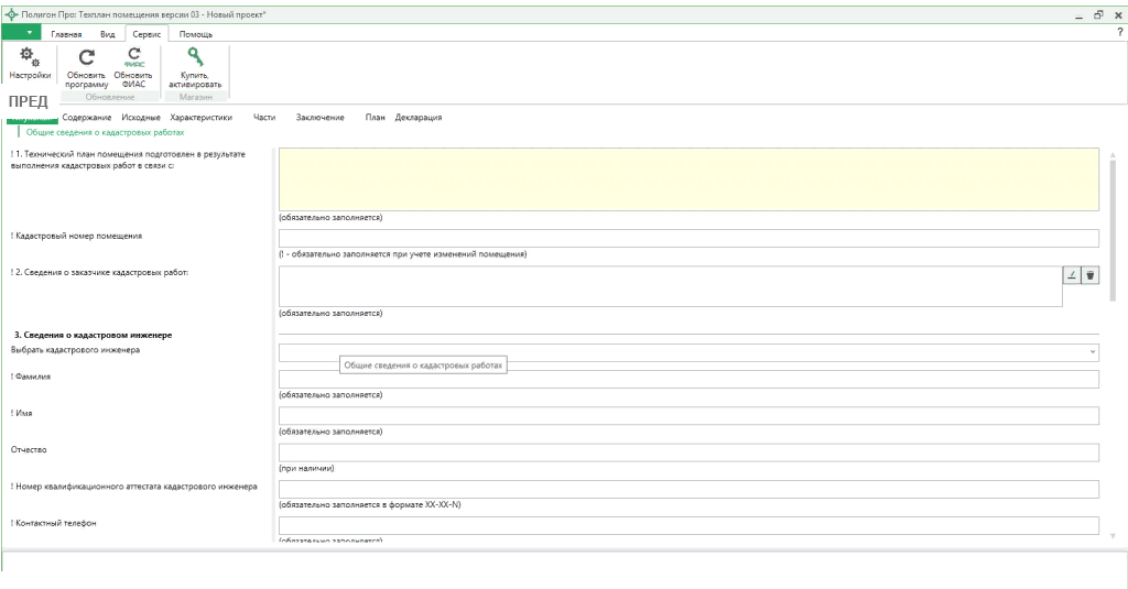 - Ввод сведений о заказчике, кадастровом инженере, исходных данных, характеристик помещения: кадастрового или иного номера здания, помещения, номера этажа, адреса, назначения, вида, площади помещения; заключения кадастрового инженера.
