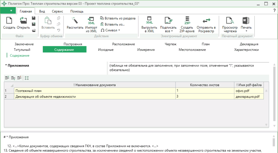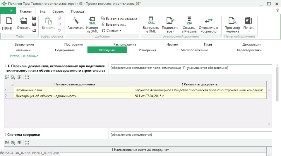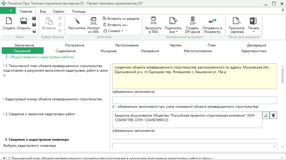 "Полигон Про: Техплан строительства" - программа для автоматизации заполнения технического плана объекта незавершенного строительства - документов и чертежей для постановки объектов незавершенного строительства (зданий, сооружений) на ГКУ, внесения новых сведений (изменений) об объекте с формированием как печатных, так и электронных XML-документов, созданием ZIP-архива, а также отправки в Росреестр.