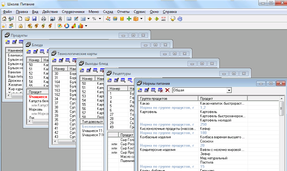 Программа «Школа: Питание» предназначена для автоматизации работы сотрудников в школах и гимназиях, образовательных учреждениях начального, основного, среднего (полного) общего образования: диетсестры и заведующей столовой. Программный продукт позволяет составлять план-меню, меню на день за считанные минуты, имеется возможность быстрого составления отчетов (бракеражные журналы, журнал витаминизации, 2 вида отчетов о химическом составе, накопительные ведомости прихода и расхода продуктов питания, анализ плана-меню на соответствие нормам питания, ведомость контроля за рационом питания).