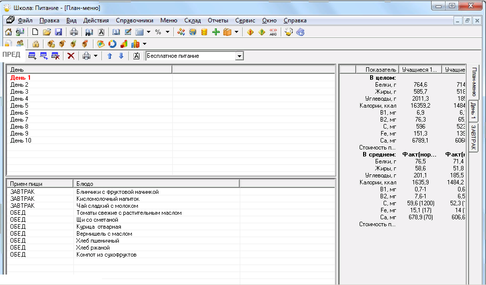 - Составление сбалансированного плана-меню на любой период с использованием различных технологических карт и рецептур, его корректировка и печать с различными параметрами (печатные формы плана-меню соответствует требованиям СанПиН 2.4.5.2409-08 или СанПиН 2.4.4.3155-13, а также СанПин 2.4.2.2821-10 (с изм. от 24.11.2015 №81). В программе 2 варианта примерного 10-ти дневного меню на 2-х разовое питание и на 4-х разовое питание, а также 10-ти дневное меню свободного стола.
