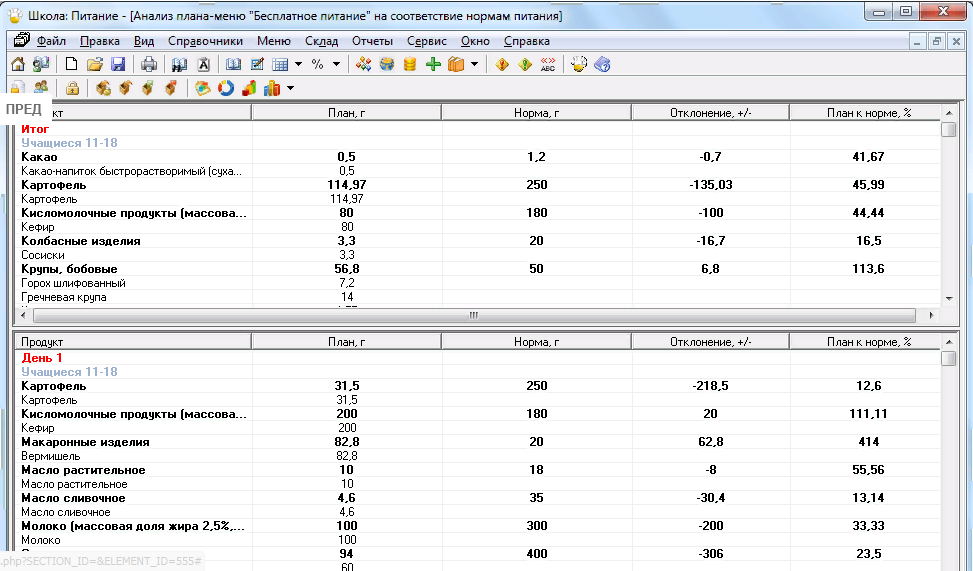 - Анализ отклонения фактической себестоимости дето-дня от плана; анализ плана-меню на соответствие нормам питания СанПиН.