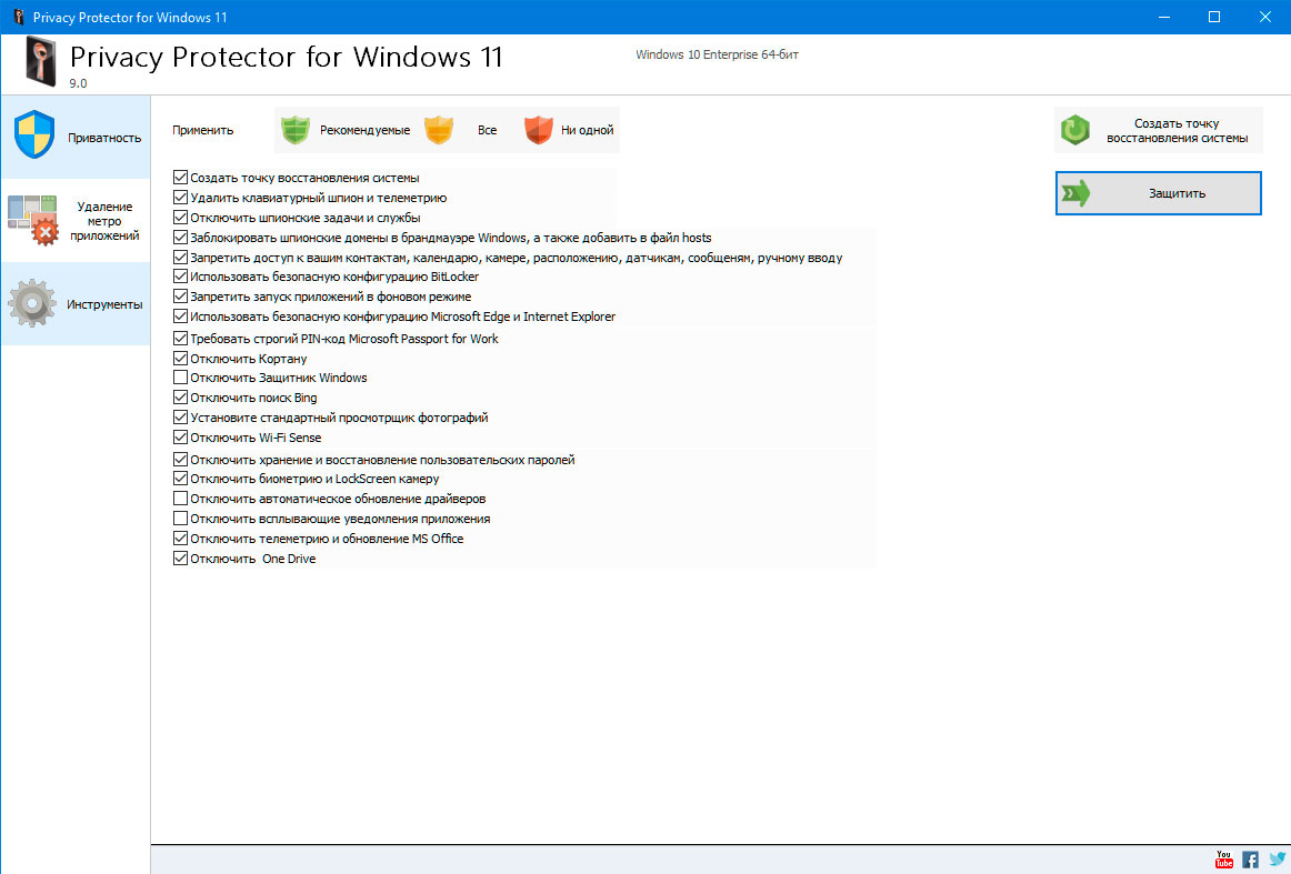 Программа Privacy Protector for Windows 11 позволяет отключить сервисы сбора персональных данных пользователей в операционной системе Windows 11.